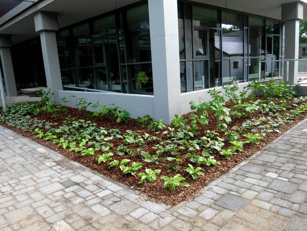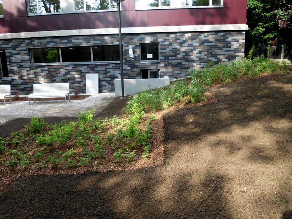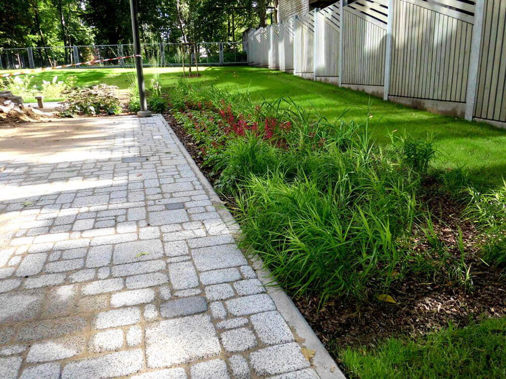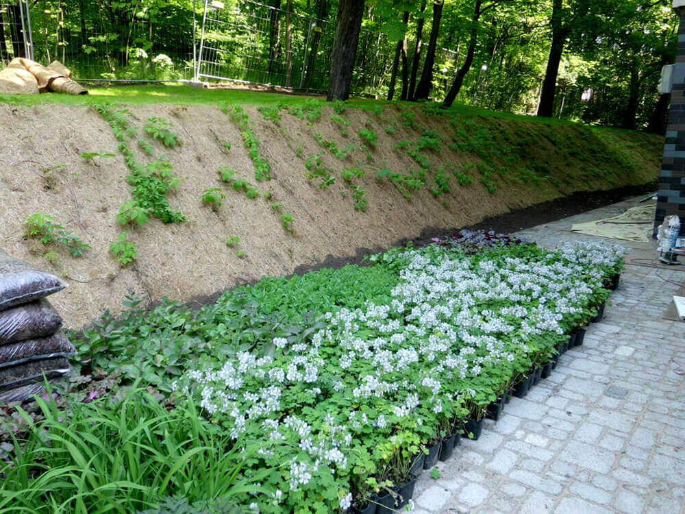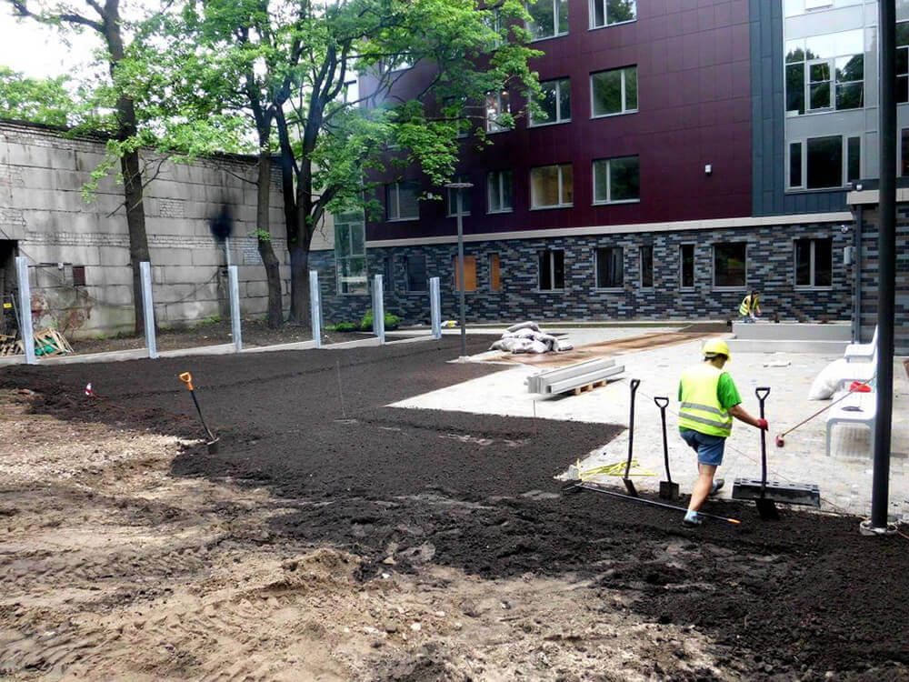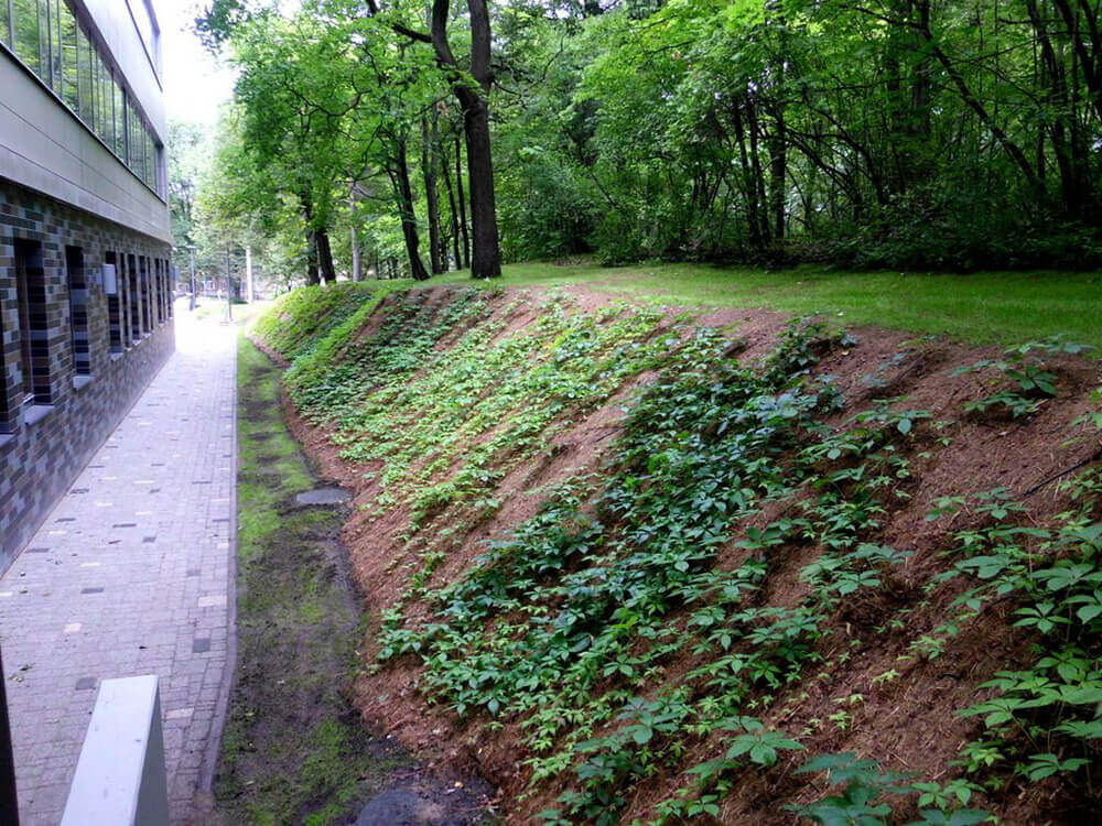 VEIKTIE DARBI: NOGĀŽU STIPRINĀŠANA AR DABĪGO ĢEOPAKLĀJU, ZĀLIENŠŪNU IEKLĀŠANA, ZĀLIENA UN APSTĀDĪJUMU IERĪKOŠANA, CELIŅU UN LAUKUMU BRUĢĒŠANA UN ASFALTĒŠANA, LABIEKĀRTOJUMA ELEMENTU (SOLI, ATKRITUMU URNAS, VELOTURĒTĀJI, KAROGU MASTI) UZSTĀDĪŠANA