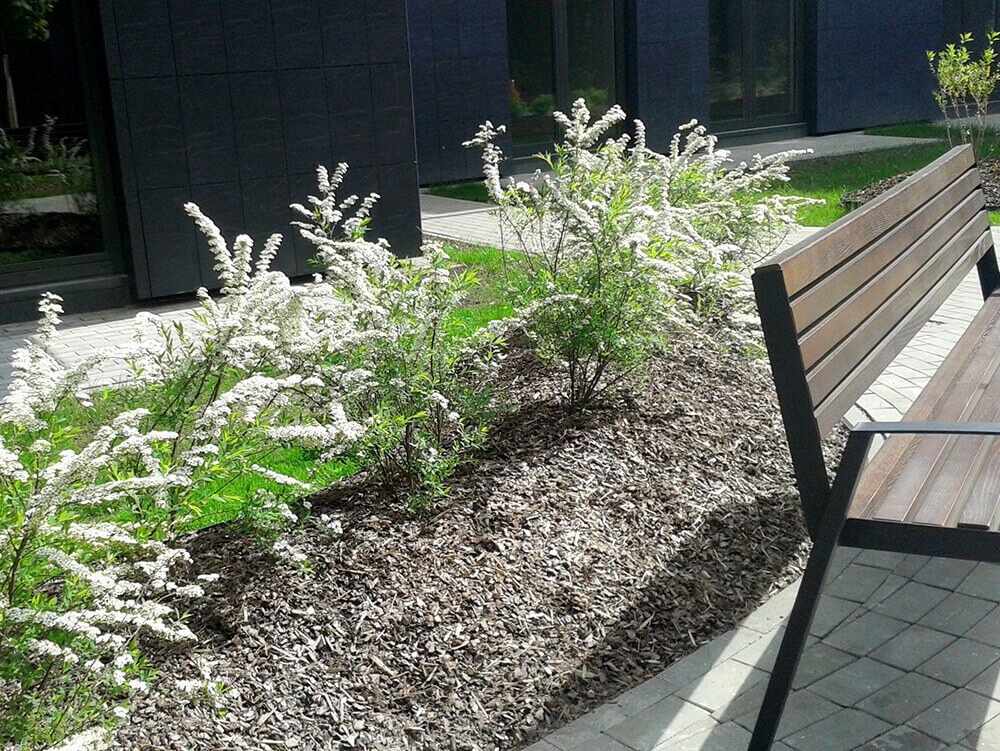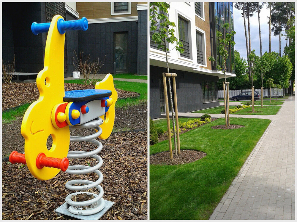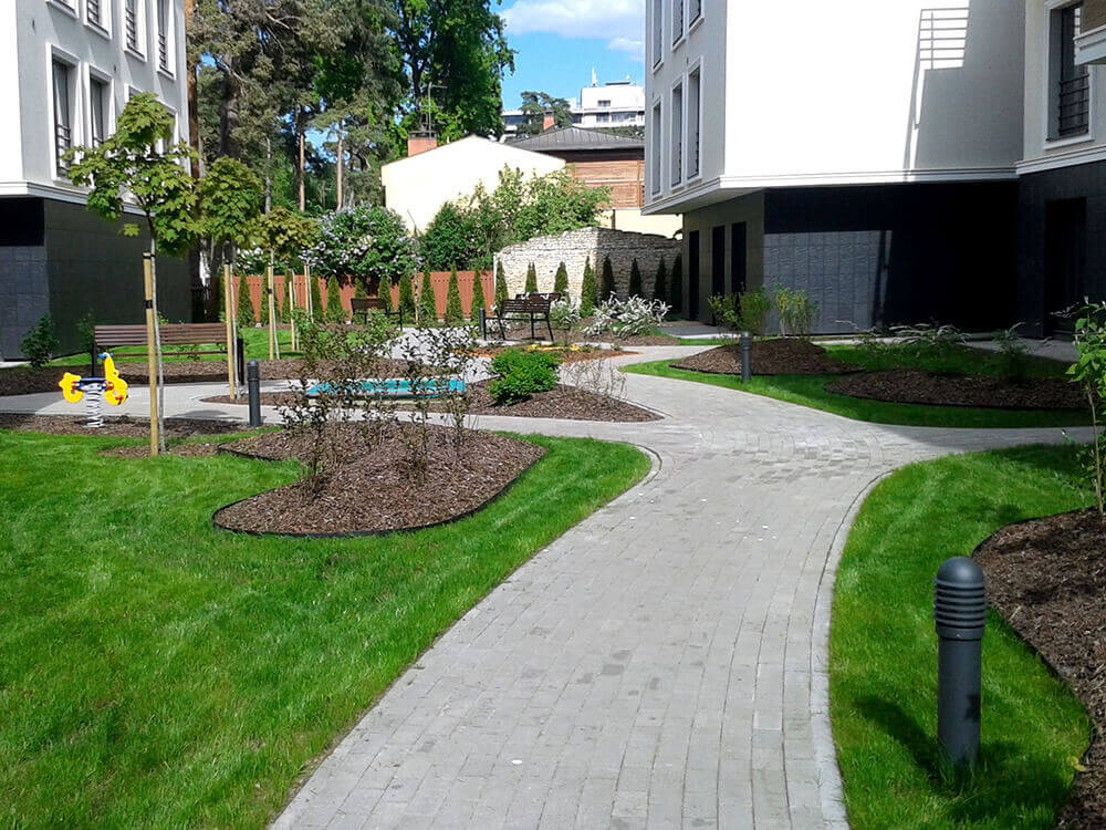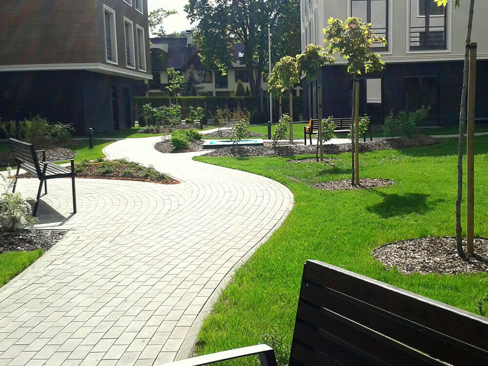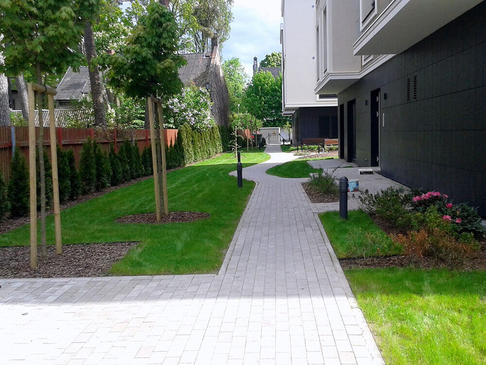 VEIKTIE DARBI: BRUĢA IEKLĀŠANA CEĻIEM UN LAUKUMIEM 1250 M2, ŽOGA IERĪKOŠANA VIRS PAZEMES AUTOSTĀVVIETĀM 1082 M2, STĀDĪJUMI 461 M2, KĀ ARĪ MAZO ARHITEKTŪRAS FORMU UZSTĀDĪŠANA