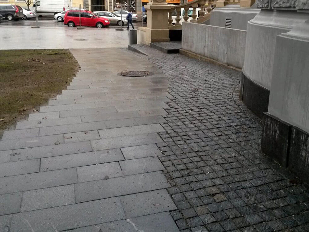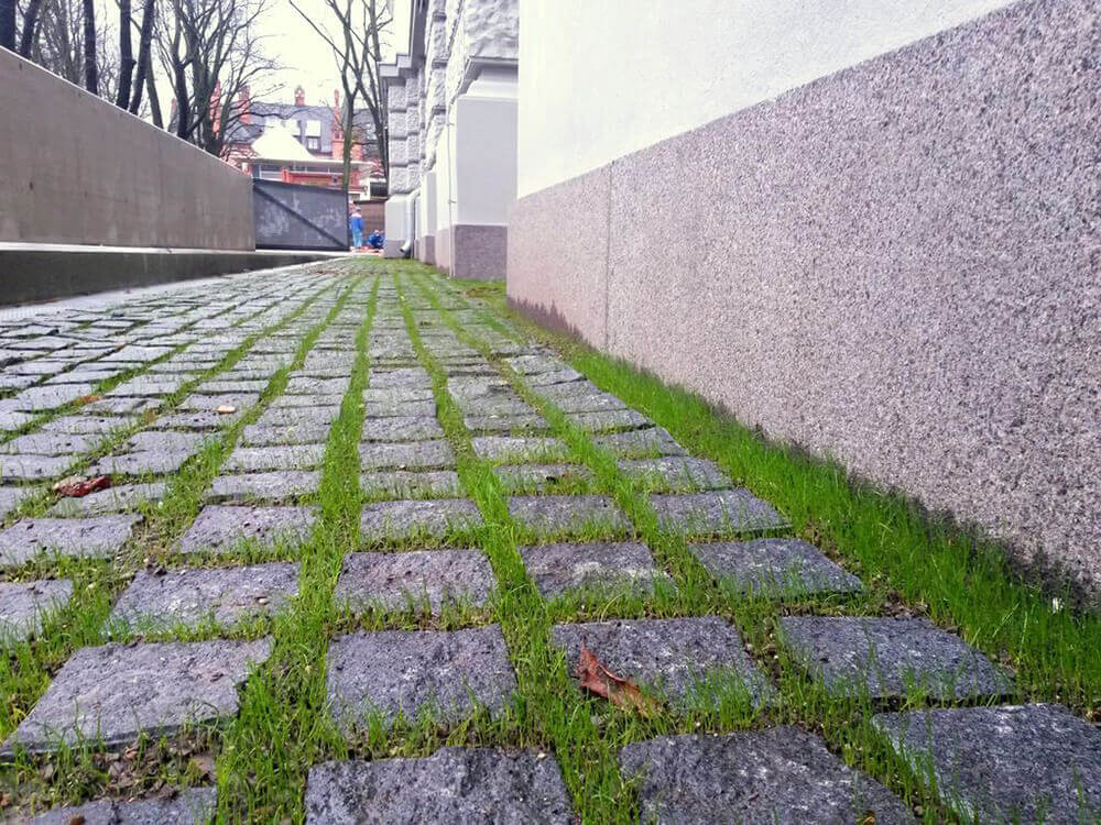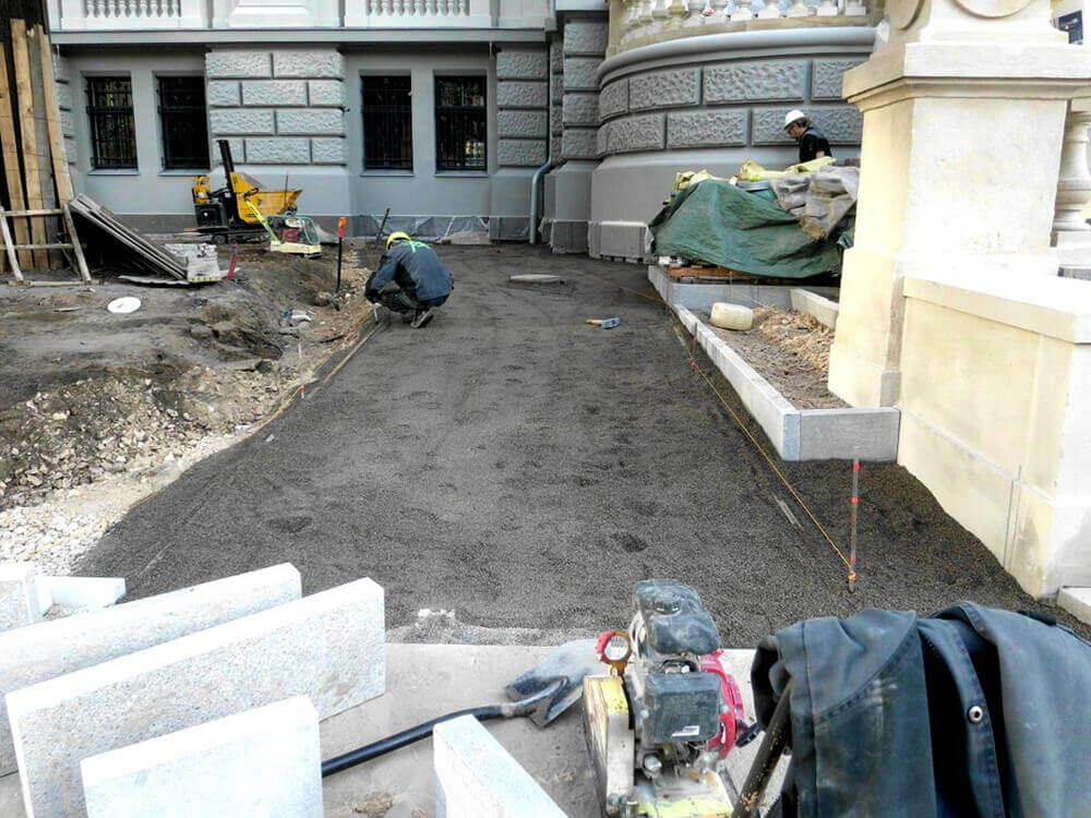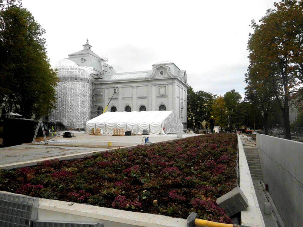 VEIKTIE DARBI: BETONA UN GRANĪTA BRUĢA/ PLĀKŠŅU IEKLĀŠANA CEĻIEM UN LAUKUMIEM, AR ZĀLIENŠŪNĀM STIPRINĀTA GRANTS SEGUMA IZVEIDE, GRANTS CELIŅA IZBŪVE KOKU ALEJĀ, CEĻA BARJERAS UZSTĀDĪŠANA, JUMTA DĀRZA IERĪKOŠANA, ZĀLIENA UN APSTĀDĪJUMU IERĪKOŠANA, LABIEKĀRTOJUMA ELEMENTU UZSTĀDĪŠANA