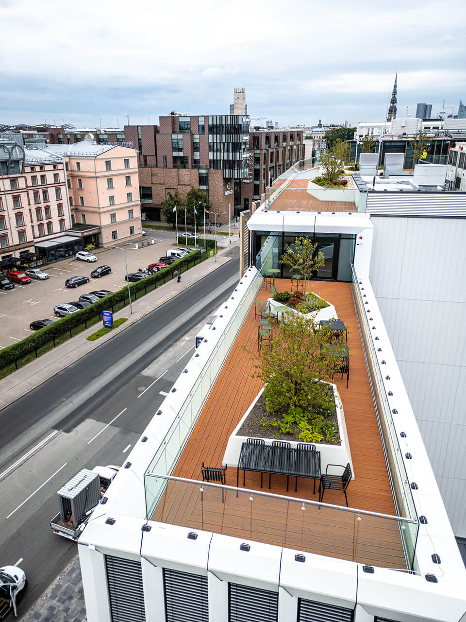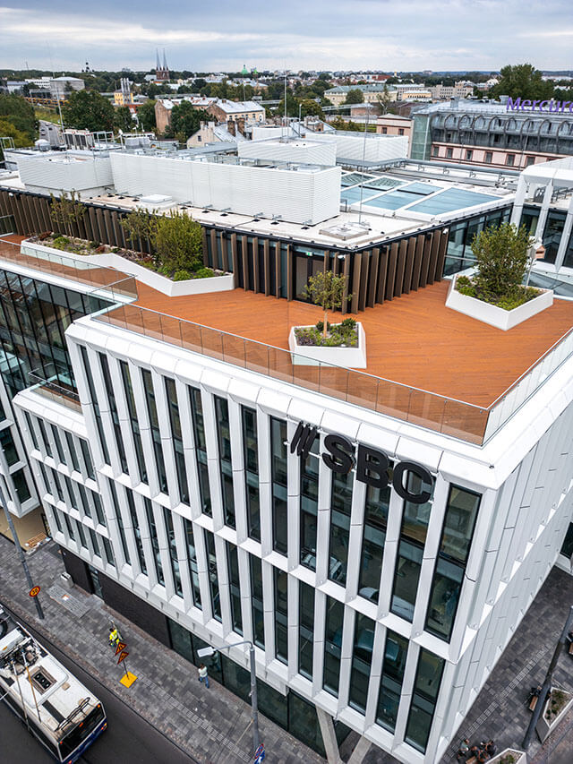 VEIKTIE DARBI: APSTĀDĪJUMU IERĪKOŠANA, LABIEKĀRTOŠANAS DARBI, KOKA DĒĻU UN FLĪŽU SEGUMA IZBŪVE JUMTA TERASĒS, PUĶU PĻAVAS IERĪKOŠANA, DEMONTĀŽAS DARBI , BETONA UN GRANĪTA PLĀKŠŅU UZSTĀDĪŠANA